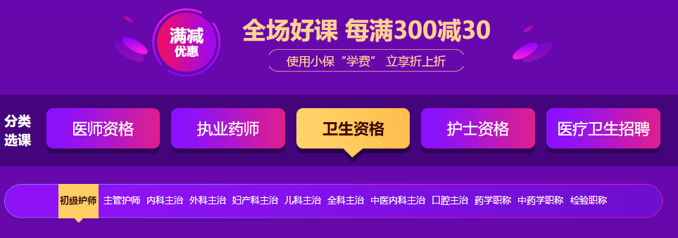 2020卫生资格考试辅导高效取证班、无忧直达班以及超值精品班购课享受满300立减30优惠,还有单科课程叠加报名享优惠!对了!还可以跟抽到的“学费”一起使用!优惠不停!