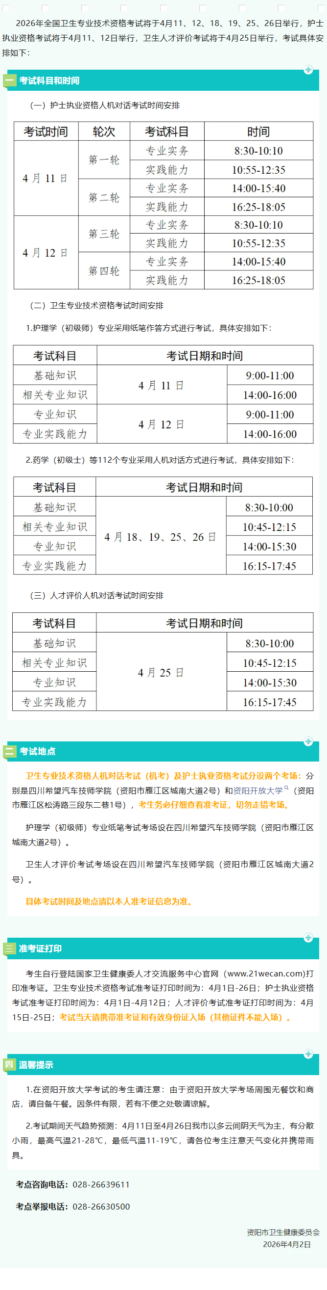 资阳关于2026年全国卫生专业技术资格考试、护士执业资格考试和卫生人才评价考试安排的公告