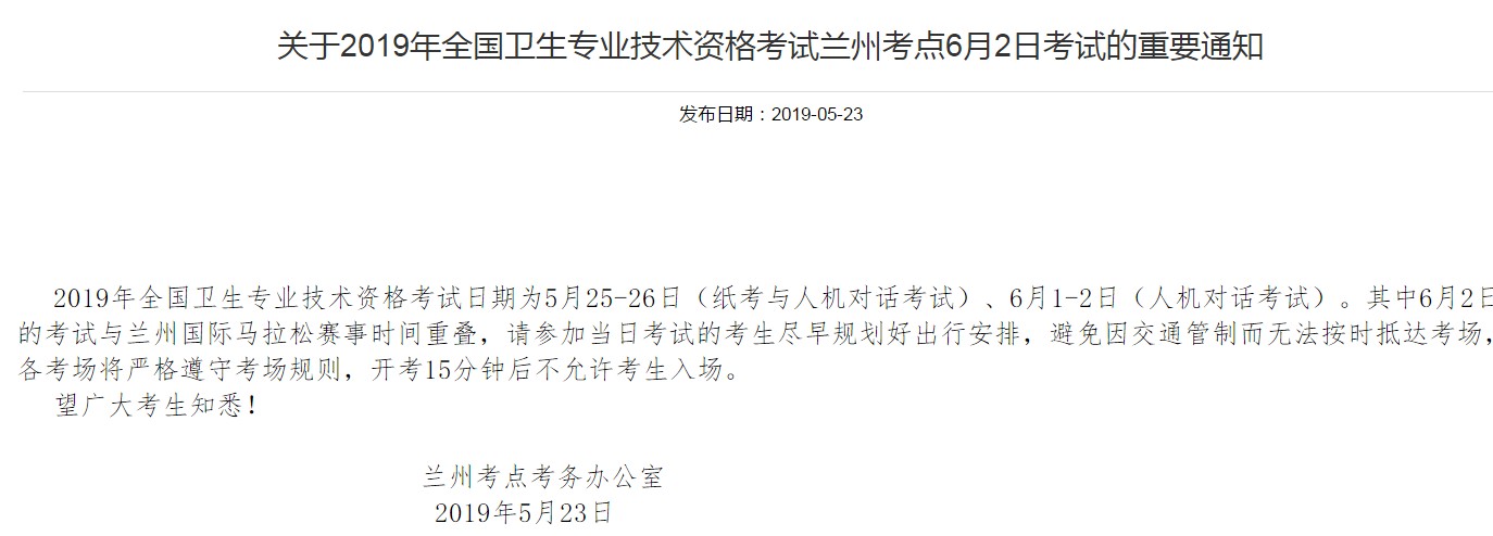 关于2019年卫生专业技术资格考试兰州考点6月2日考试的重要通知已经公布,为了帮助大家了解,医学教育网为大家搜集整理如下:
