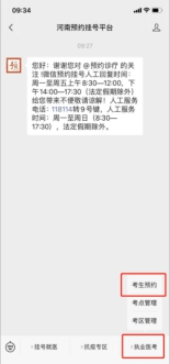 网上预约方式:关注微信公众号“河南预约挂号平台”点击“执业医考”选择“考生预约”,按照发布的预约时间在网上预约现场信息采集时段。(未拿到初审单位下发的《医师资格考试报名暨授予医师资格申请表》考生请勿预约)。