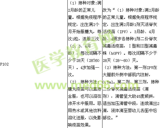 | P101 | 它引起的免疫反应通常是体液免疫,很少引起细胞免疫。 | 它引起的免疫反应通常是体液免疫,很少引起细胞免疫。 此句话下面添加“(四)接种单位应具备的条件 1.具有医疗机构执业许可证书。 2.具有经过县级人民政府卫生主管部门组织的预防接种专业培训并考核合格执业医师、执业助理医师、护士或乡村医生。 3.具有符合疫苗储存、运输管理规范的冷藏设施、设备和冷藏保管制度。 4.承担预防接种工作的城镇医疗卫生机构,应当设立预防接种门诊。” |