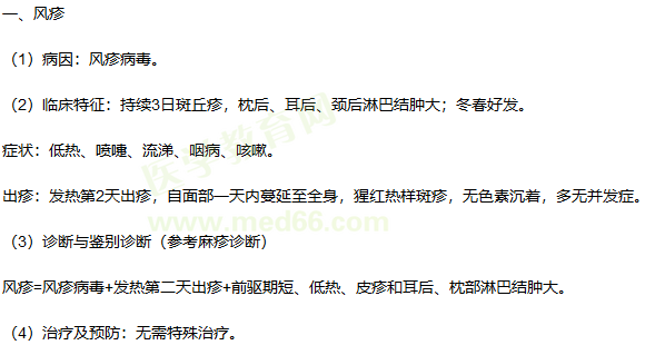 该知识点均为感染性疾病,医学|教育网首先都有感染性的特点,一般要有一个潜伏期,再有发热,然后全身的症状,胃口不佳,随着疾病发展到一定程度都有典型的皮疹表现出来。所以,本知识点重要的仍是鉴别,掌握了鉴别点,才能进一步的进行判断治疗。题型多为A型。