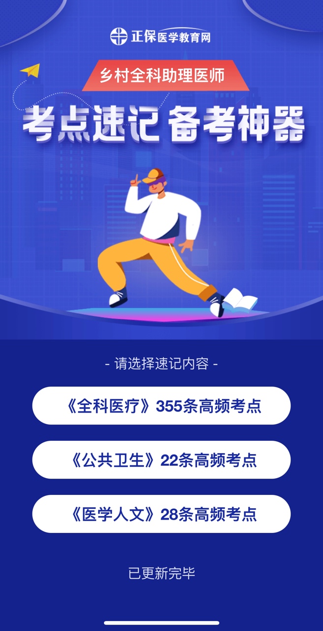 60秒一个考点!乡村全科助理医师考点速记神器帮你做到考前冲刺,进入笔试的冲刺阶段,笔试考试范围大、考点多,为了医学教育网带来了“乡村全科助理医师考点速记神器”,你值得拥有!