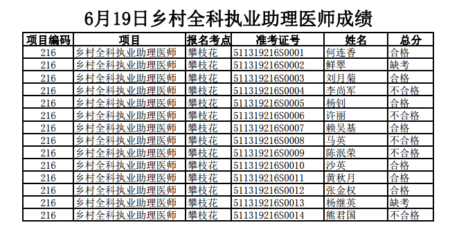 四川省攀枝花2019年6月15-18日医考实践技能考试成绩公布汇总!