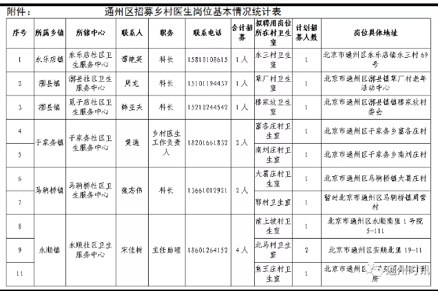 招募范围:永乐店、于家务、漷县、马驹桥、永顺、觅子店等6个地区10个村卫生室11名乡村医生岗位人员。