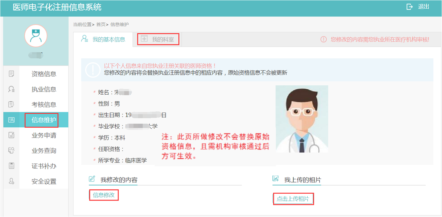 此功能模块可修改个人信息,修改信息需执业所在医疗机构审核通过后才能生效。