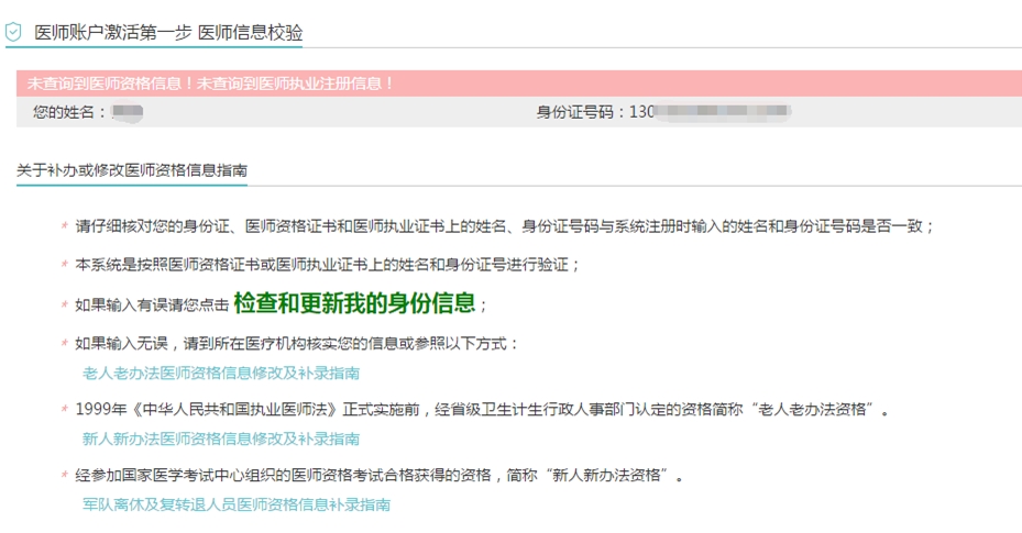 若未通过医师资格校验,则可能是注册时填写的姓名及身份证号码有误,请修改正确后继续验证;如果确认姓名及身份证号码无误,请在系统内“资格补【改】指南”菜单中查看解决办法。