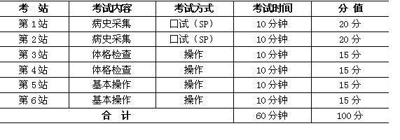 主要考查病史采集、体格检查和基本操作技能,同时对沟通交流能力与人文关怀进行评价。考站数量为6站,考试时间为60分钟。将沟通能力、人文关怀等职业素质的考核融合到各站案例,分值约占15%.考站设计详见下表: