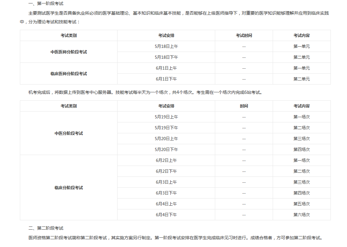 医师分阶段考试分为实践技能考试和医学综合笔试两部分。第一阶段考试一般为6月,第二阶段考试时间为两年后的7月,2018年临床医师分阶段考试时间为2018年6月1日-6月4日,2018年中医医师分阶段考试时间为2018年5月18日-5月20日