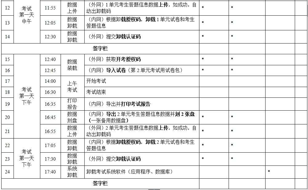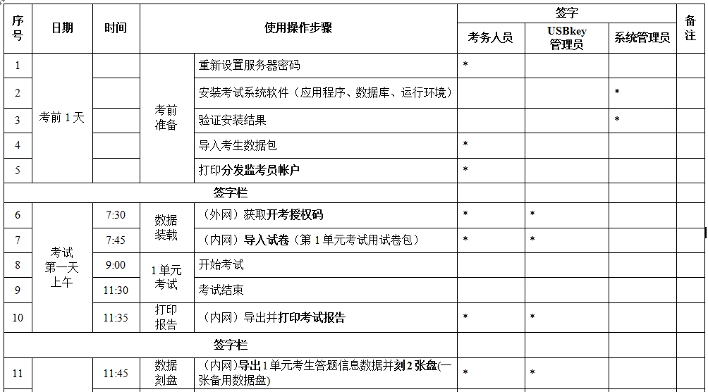 说明:各类人员每完成一项在相应栏目内划“√”,第一天全部准备工作结束签字,考试开始后每半天工作完成后签字。