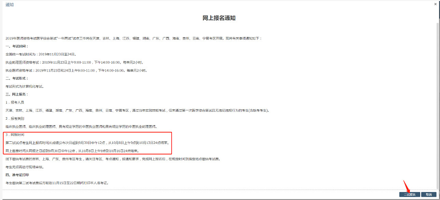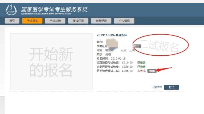 请各位符合二试报名条件的考生在规定时间内尽快登录国家医学考试网系统-考试成绩-查看成绩-二试说明处进行报名及缴费,逾期不予补报。