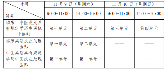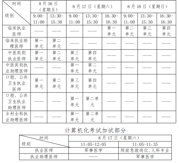 考试实行计算机化考试,军队现役人员加试军事医学,院前急救岗位和儿科专业加试相应内容。执业医师合格分数线为 360分,执业助理医师合格分数线为 180 分。全国统一考试时间如下: