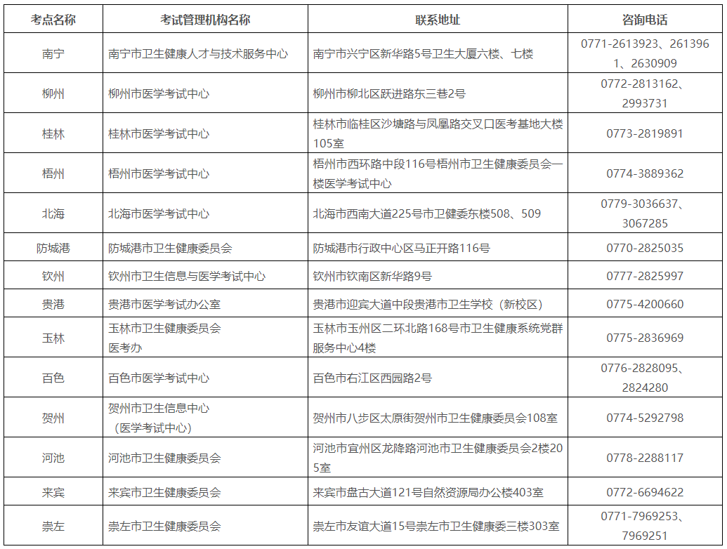 广西壮族自治区医学考试中心(南宁市青秀区桃源路3号),电话:0771-2618852。