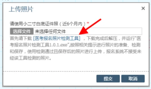 (一)考生在网报系统上传个人小二寸白底证件照时,应按照系统提示内容下载并运行“医考报名照片检测工具”,网报系统只接受经该工具检测通过且保存后的照片。