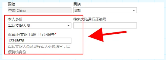(二)现役军人和部队文职人员报名时,须使用有效的居民身份证进行申报,在网报系统本人身份一栏中选择相应的“军人”身份,并填写相关的军官证、警官证、文职干部证、士兵(官)证和军队学员证等证件号码。