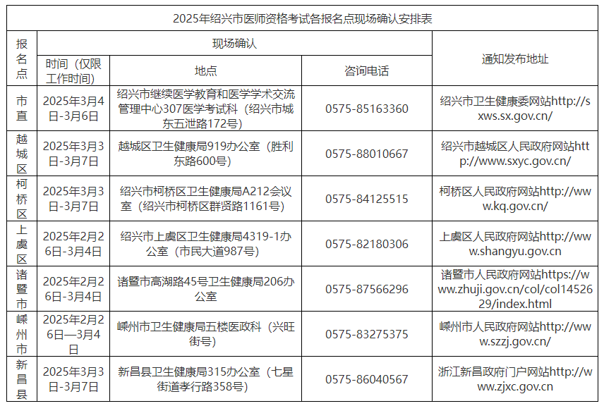 2026年绍兴市医师资格考试各报名点现场确认安排表