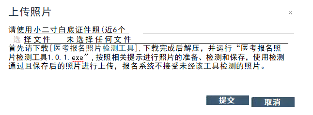 (一)考生在网报系统上传个人小二寸白底证件照时,应按照系统提示内容下载并运行“医考报名照片检测工具”,网报系统只接受经该工具检测通过且保存后的照片进行上传。