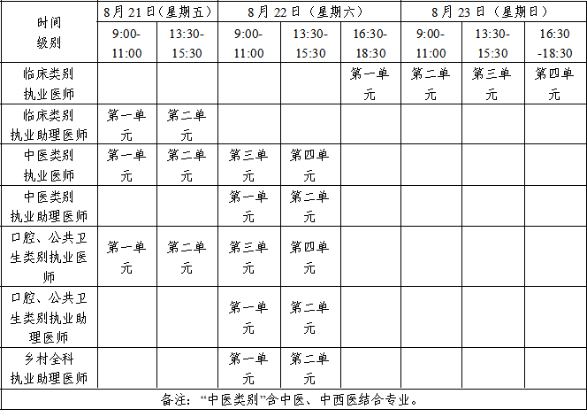 医学综合考试均为计算机化考试,军队现役人员、文职人员加试军事医学,院前急救岗位和儿科专业加试相应内容。统一考试时间如下: