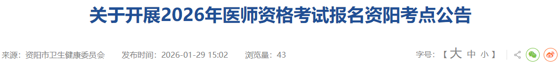 四川资阳考点2026年医师资格考试报名|审核|考试要求已公布!请相关考生及时查看,做好报名审核准备!