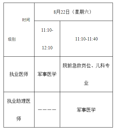 临床类别、乡村全科执业助理医师、公共卫生类别、军队考生实践技能考试由成都考点国家基地承担;中医类别实践技能考试由绵阳考点国家基地承担;口腔类别实践技能考试由泸州考点国家基地承担。时间安排如下: