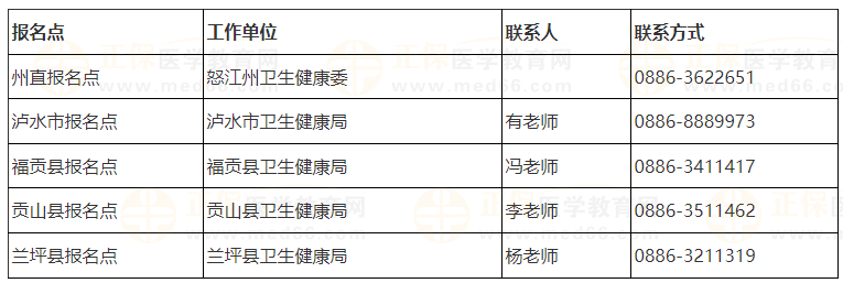 2026年度医师资格考试怒江考点分设州直、泸水市、福贡、贡山、兰坪县5个报名点。其中,州卫生健康负责州直医疗卫生单位考生线上审核及军队现役考生现场审核和相关材料收集工作,各县(市)卫生健康局负责辖区内医疗卫生单位(含民营医疗机构)及计生服务机构考生线上初审及相关材料收集工作。各报名点联系方式如下: