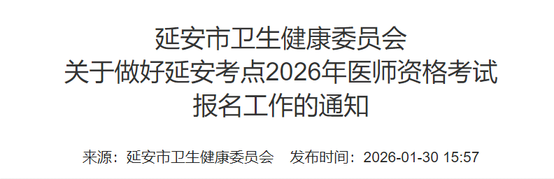 按照国家卫生健康委医师资格考试委员会《公告》(2026年第1号)和陕西省卫生健康委医师资格考试领导小组办公室公告要求,现就2026年医师资格考试延安考点报名和资格审核有关事项通知如下: