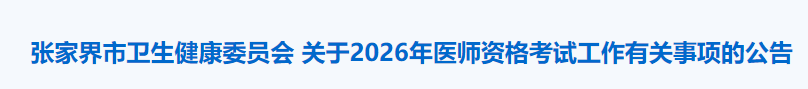 根据《国家卫生健康委员会医师资格考试委员会公告》(2026年第1号)和《湖南省卫生健康委员会公告》(2026 年第1号)要求,现就张家界市2026 年医师资格考试工作有关事项公告如下: