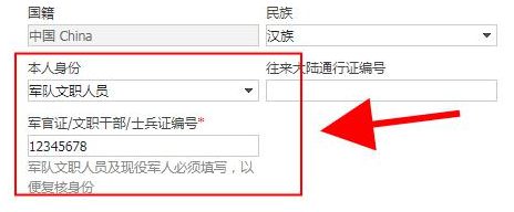 (二)现役军人和部队文职人员报名时,须使用有效的居民身份证进行申报,在网报系统本人身份一栏中选择相应的“军人”身份,并填写相关的军官证、警官证、文职干部证、士兵(官)证和军队学员证等证件号码。