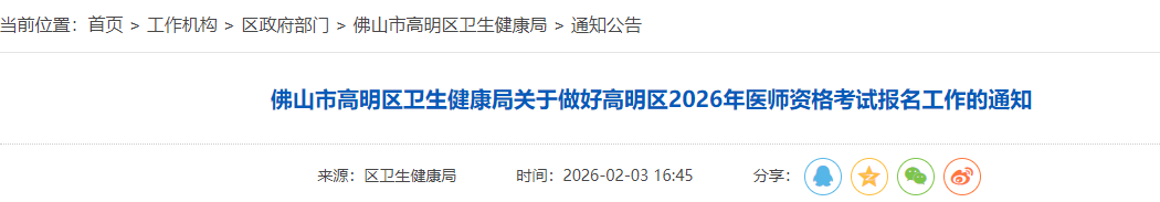 (3)我局根据上级主管部门文件和要求整理制定了《佛山市高明区2026年医师资格考试报名相关要求》(附件1)供各单位的考生阅读并指导考生按照要求报名。