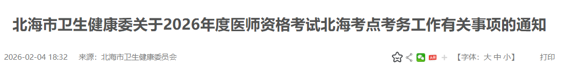 根据广西壮族自治区卫生健康委员会公告(2026年第3号)以及医师资格考试相关规定,为做好2026年度医师资格考试北海市考点考务工作,现将有关事项通知如下: