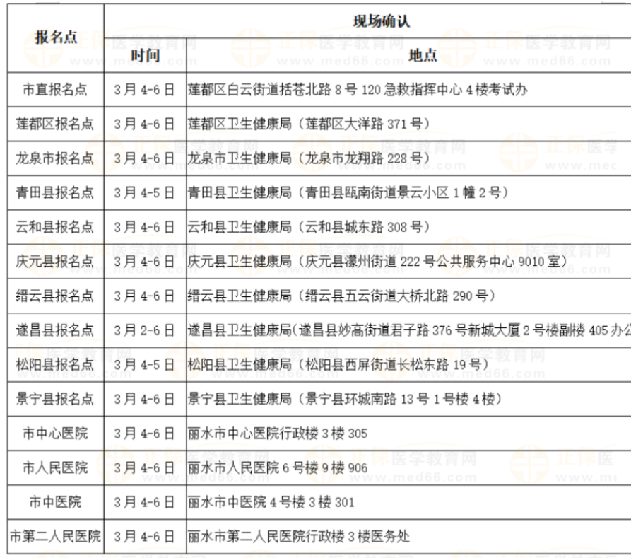 (五)市属医疗卫生单位设报名点的单位有丽水市中心医院、丽水市人民医院、丽水市中医院和丽水市第二人民医院,设立报名点单位的考生在本单位报名审核确认;市辖区其他医疗卫生健康单位考生到丽水市医学学术信息管理中心(莲都区白云街道括苍北路8号120急救指挥中心4楼)进行报名审核确认。各县(市、区)报名点设在当地卫生健康局,考生按所在单位的行政区划去当地管辖的卫生健康局报名点报名审核确认。