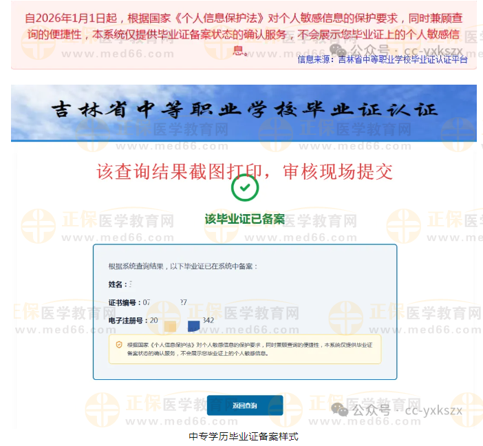 ●吉林省中专毕业证需打印毕业证备案状态页面截图(新版),样式如下(吉林省中等职业学校毕业证认证网址https://renzheng.jlipedu.cn/)