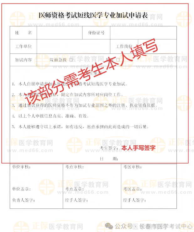 12.报考执业医师短线加试(院前急救、儿科)的考生还需提交《医师资格考试短线医学专业加试申请表》新版样式如下(请登录国家医学考试网考生服务系统下载),军事医学加试无需填写;