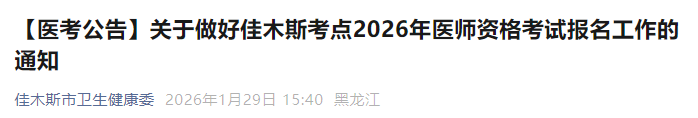 根据《中华人民共和国医师法》《医师资格考试暂行办法》《国家卫生健康委员会医师资格考试委员会公告》(2026年第1号)和《关于做好黑龙江考区2026年医师资格考试报名工作的通知》(黑医考办发〔2026〕2号)规定,2026年医师资格考试临床、口腔、公共卫生类别和乡村全科执业助理医师医学人文部分启用修订后的考试大纲。现将佳木斯考点2026年医师资格考试报名工作有关事宜通知如下: