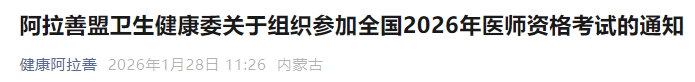 根据《中华人民共和国医师法》和《医师资格考试暂行办法》规定,国家卫生健康委员会将在全国举行2026年医师资格考试。临床、口腔、公共卫生类别和乡村全科执业助理医师医学人文部分启用修订后的考试大纲。现将阿拉善盟组织参加2026年全国医师资格考试有关事项通知如下: