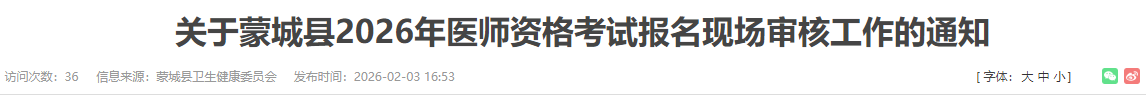 安徽亳州蒙城县2026年医师资格考试报名&现场审核安排已公布!请相关考生及时查看,做好报名审核准备!