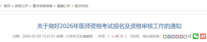贵州仁怀考点2026年医师资格考试报名&审核安排及详细要求已公布!请相关考生及时查看,按时完成报名审核!