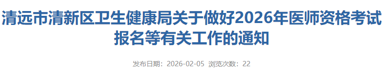 为做好我区2026年医师资格考试报名工作,根据清远市卫生健康局《关于做好2026年医师资格考试报名等有关工作的通知》要求,并将有关事项通知如下,请遵照执行。