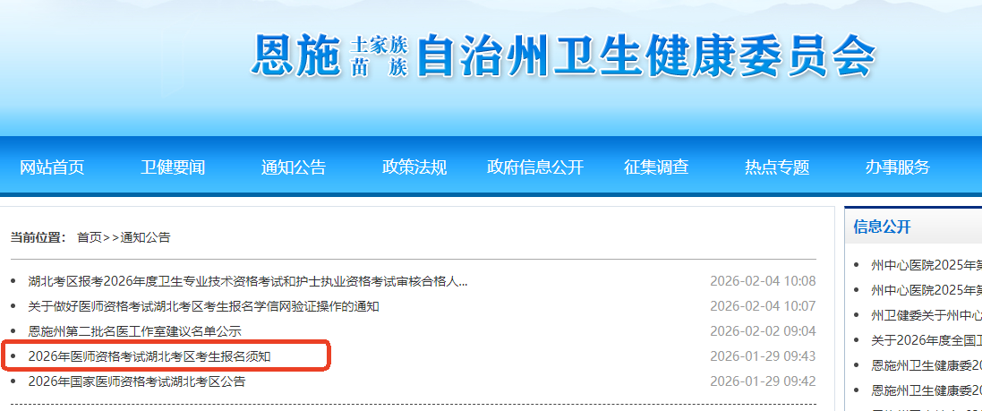 湖北恩施州2026年医师资格考试报名须知及材料要求已公布!请相关考生及时查看,做好报名审核准备!