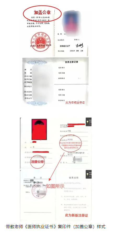 7.带教老师《医师执业证书》(即注册证)复印件,并加盖公章(照片页、个人信息页及变更注册记录页需复印完整。如果字迹不能看清,需提交带教老师执业证书原件)。