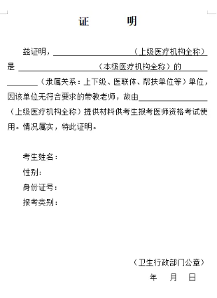 10.上下级(医联体、帮扶单位等)关系证明:村卫生室、乡镇卫生院等无符合要求带教老师的,可由上级医疗机构带教老师带教,需提供上级医疗机构执业许可证复印件并加盖上级机构公章、上级的带教老师资格证复印件与执业证复印件并加盖上级机构公章、本级的医疗机构执业许可证复印件并加盖本单位公章。工作实践证明填写上级机构信息,需加盖上级机构和本单位公章各一个(两个章)。还需提供上下级、医联体或帮扶单位等文件的复印件并加盖单位公章,如无文件则需提供“医疗机构上下级关系证明”,并加盖卫生行政部门公章。