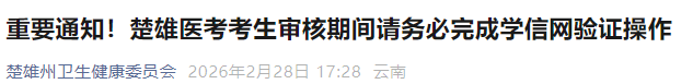 考生注意:云南楚雄州2026年医师资格考试信网验证已开始!请之前没有完成学信网验证的考生尽快扫码验证,避免影响报考!