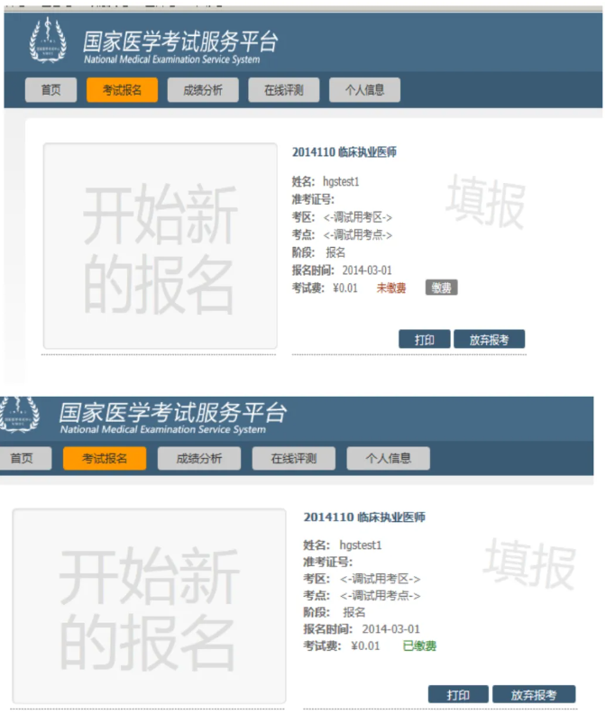 考生请关注“国家医学考试中心官网考生服务端”,考区复审通过后即出现“缴费”灰色字样,请点击并按时完成缴费, 出现“已缴费”绿色字样即为成功。