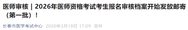 官方速报!吉林长春2026年医师资格考试考区复审已开始!第一批通过考区复审的考生的档案已经开始陆续邮寄回考生手中,考生收到档案即表示审核通过。需要补充材料等待二试复审以及未通过考区审核的考生将会陆续电话告知,请相关考生近期多关注!