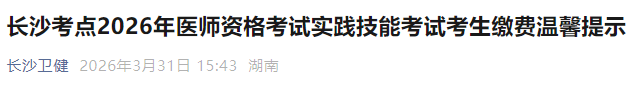 湖南长沙2026年医师资格考试实践技能缴费入口已开通!以下为湖南长沙考点官方提醒,请相关考生仔细查看,按时完成技能缴费!