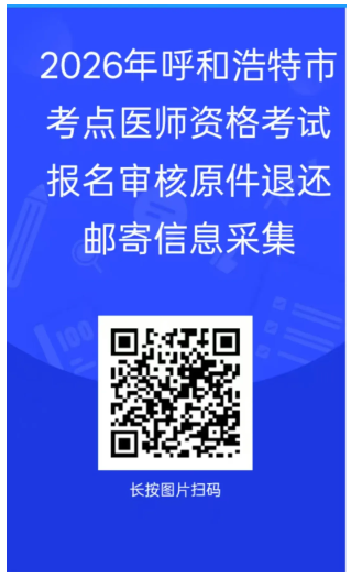 2026年呼和浩特考点医师资格考试报名审核原件已与3月27日、28日现场退还,有未在现场领取的考生,统一采取邮寄形式退还。请未领取的考生扫码尽快填写邮寄信息(务必保证填写信息准确无误),邮寄时间为3月31日——4月1日,邮费到付。