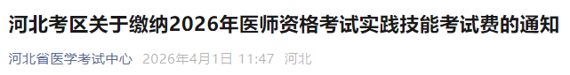 官方速报!河北省2026年医师资格考试实践技能缴费4月2日开始!以下为河北省考区官方提醒,请相关考生仔细查看,按时完成技能缴费!