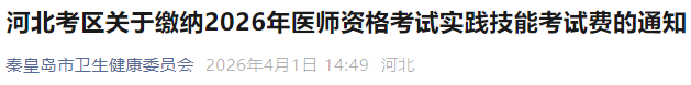 河北秦皇岛2026年医师资格考生速去实践技能缴费!4月9日截止!以下为河北秦皇岛考点官方提醒,请相关考生仔细查看,按时完成技能缴费!