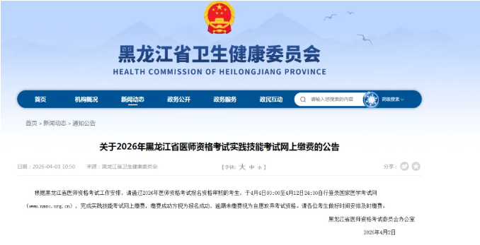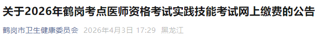 黑龙江鹤岗2026年医师资格考生速去进行实践技能缴费!以下为黑龙江鹤岗考点官方提醒,请相关考生仔细查看,按时完成技能缴费!