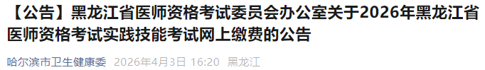 黑龙江哈尔滨2026年医师资格考试实践技能缴费入口已开通!以下为黑龙江哈尔滨考点官方提醒,请相关考生仔细查看,按时完成技能缴费!